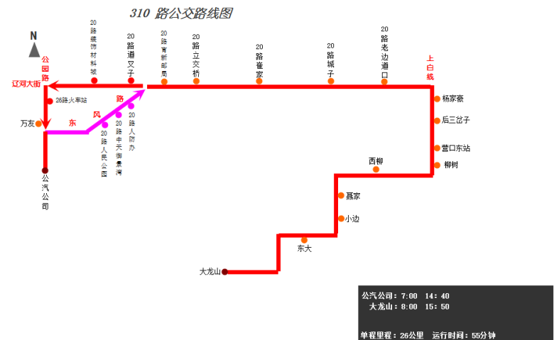 由公汽公司始發(fā),途經(jīng)公園路、建設(shè)街東風(fēng)路/遼河大街、遼河大街、營(yíng)大路、上白線(xiàn)、營(yíng)口東站路口、柳樹(shù)鎮(zhèn),終點(diǎn)到達(dá)大龍山